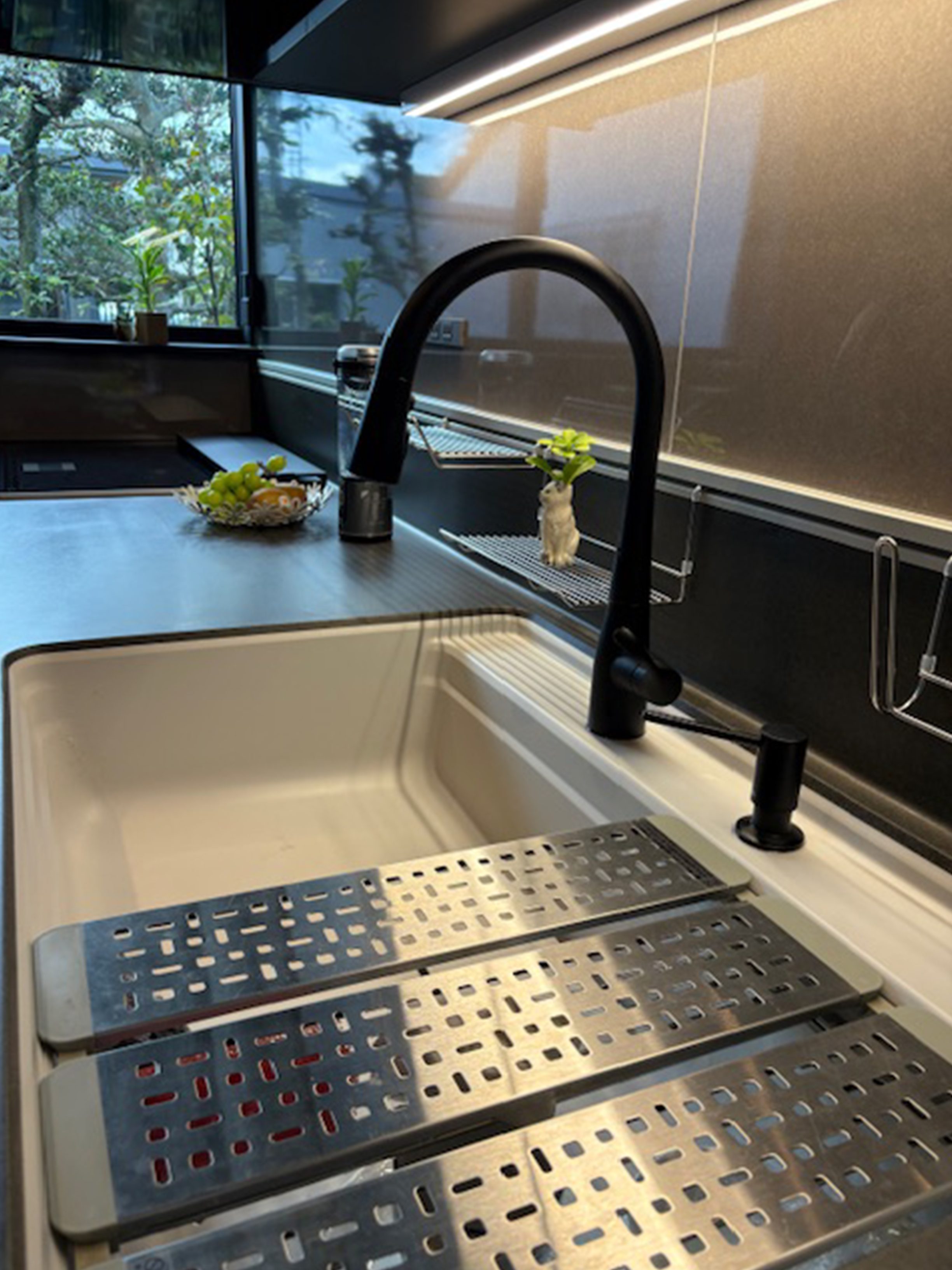 フォールディングプレートやフォールディングラックをセットすることによりシンク内で材料のカット、水切りや食材の一時置きなど調理作業ができるのでとても便利です。壁との段差がないハイバックカウンターは汚れが溜まりにくく、専用のハンガーアイテムで浮かせ置きでき、お手入れがとても簡単です。